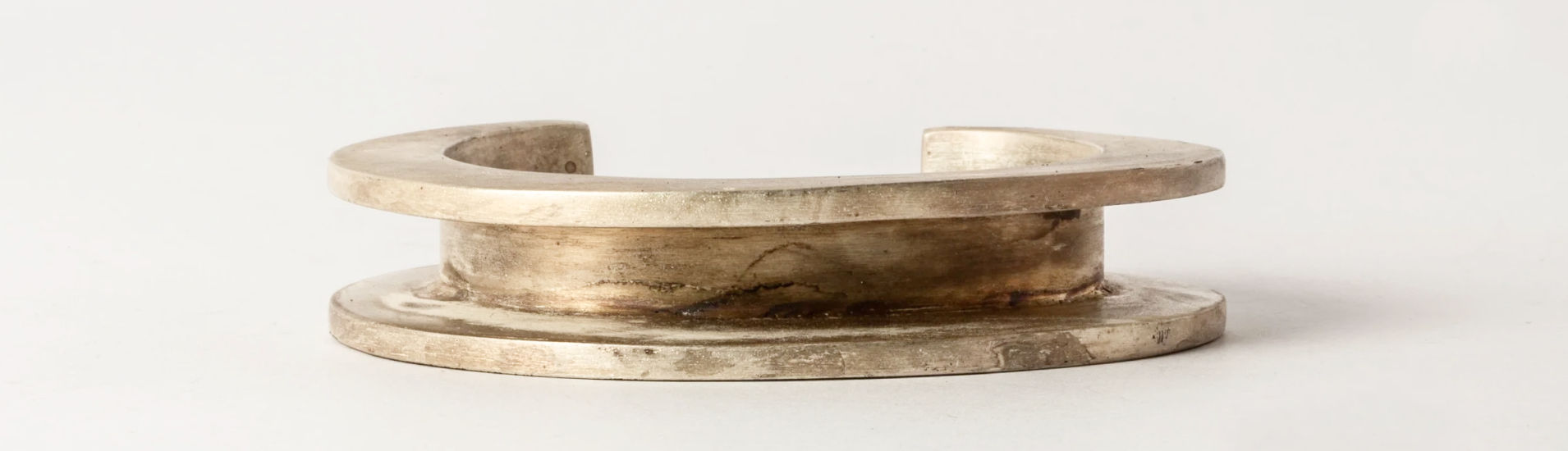This vessel is hand fabricated from acid oxidized iron plates; cut into sections and soldered together to make the hollow three-dimensional form. The metal remains untouched after construction allowing residual traces of the process to mark the surface.